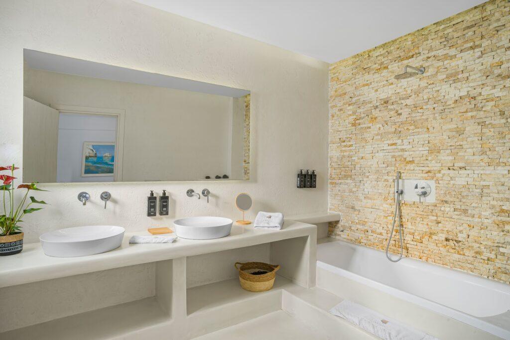 Eleion Estate accommodates up to twelve guests in five bedrooms, including a guest house with its own kitchen and living room. Because every suite features en-suite bathrooms, tranquil décor, and private verandas, restful nights and privacy are assured. In addition, the master suite includes a jacuzzi and walk-in wardrobe, so every guest experiences true luxury and comfort.