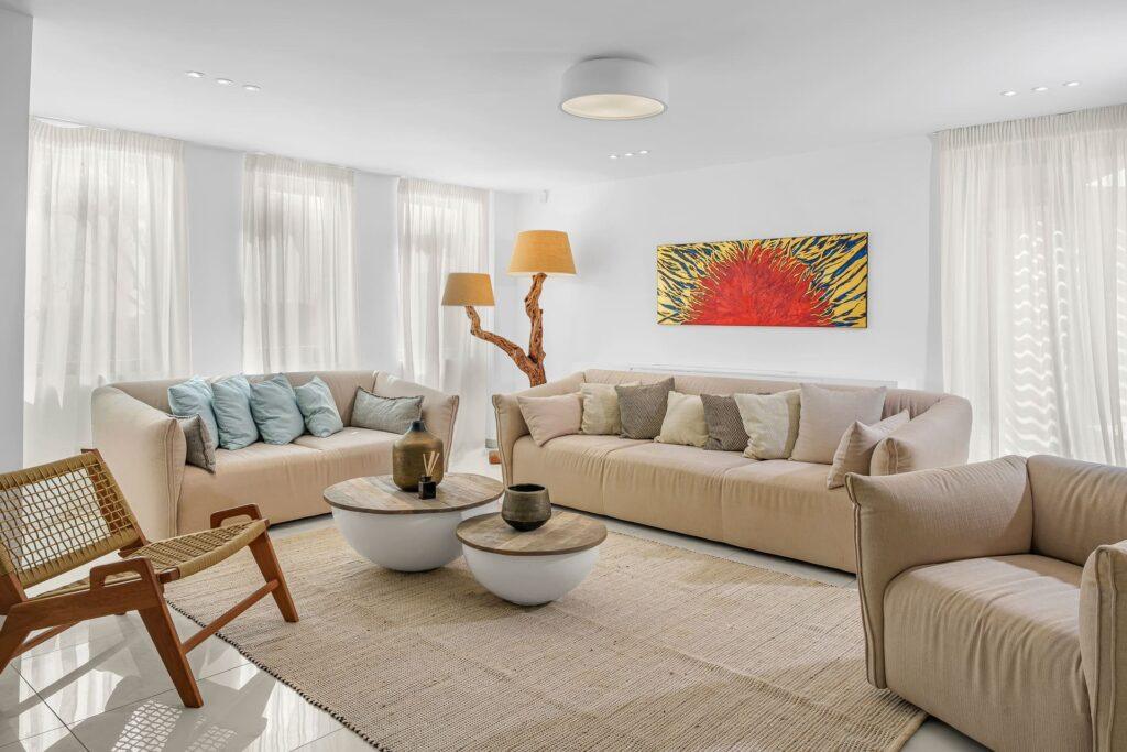 Eleion Estate accommodates up to twelve guests across a main villa and guest house, with five spacious bedrooms, each featuring en-suite bathrooms and high-end amenities. The master suite offers a jacuzzi, waterfall shower, and private verandas, while the guest house includes a full kitchen and living area. Two designer living rooms and a gourmet dining space set the tone for elegant gatherings. The estate’s unique underground wine cellar is perfect for private tastings or intimate dinners.