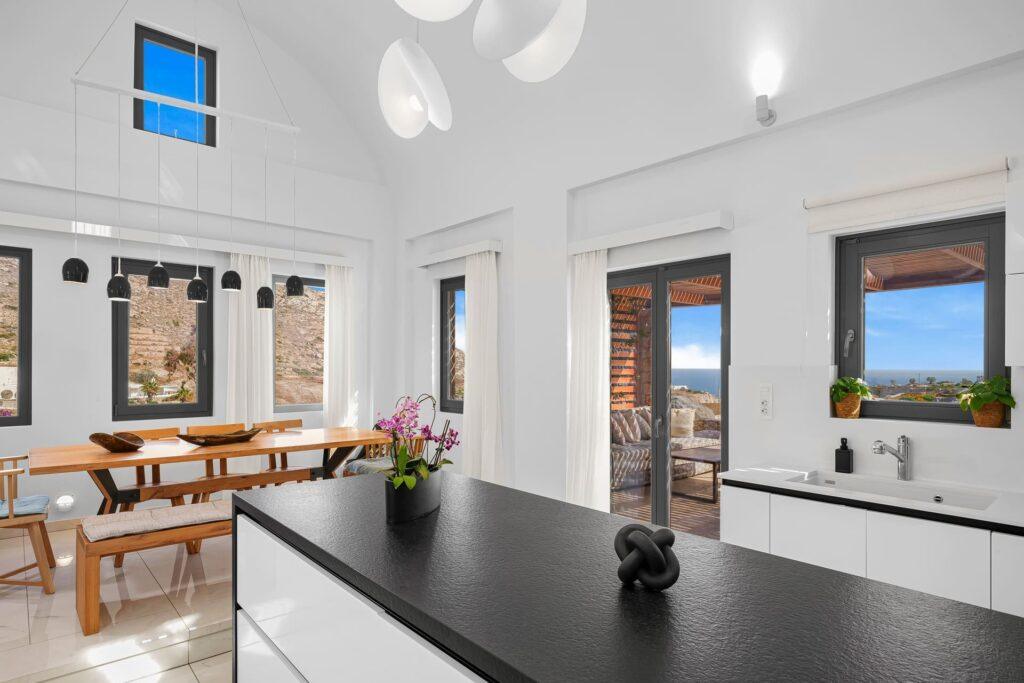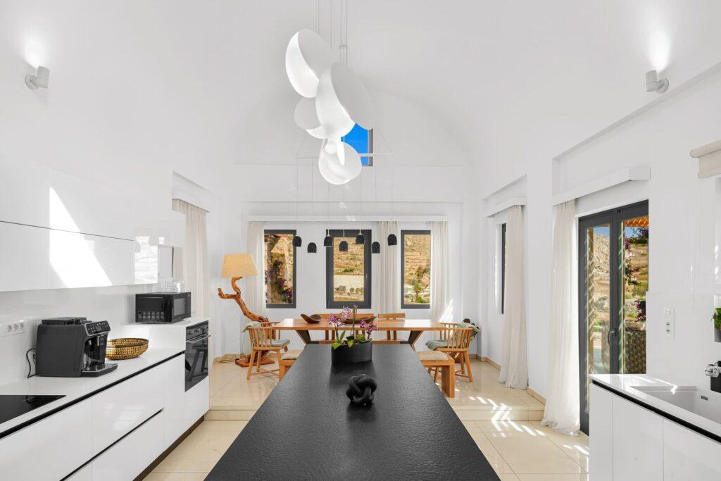 The gourmet kitchen at Eleion Estate inspires culinary creativity and social gatherings. While you have access to modern appliances and generous space for meal preparation, you can also enjoy private chef services or breakfast delivery. Since the kitchen connects easily to both the dining area and outdoor terraces, every meal becomes a memorable event with vineyard views.