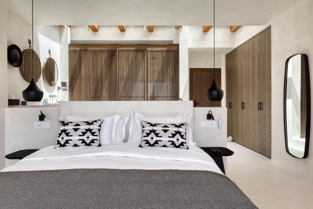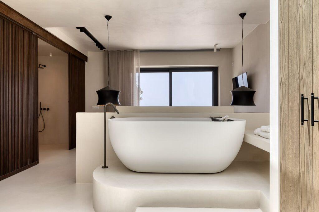 Pneuma Estate occupies a tranquil ridge. The location ensures total privacy while remaining just a short drive from Mykonos Town. Guests can admire the mesmerizing sunsets over Delos from their private terrace. At the same time, the vibrant nightlife and pristine beaches are easily accessible. Therefore, you enjoy a secluded haven that serves as a gateway to the island’s best experiences.