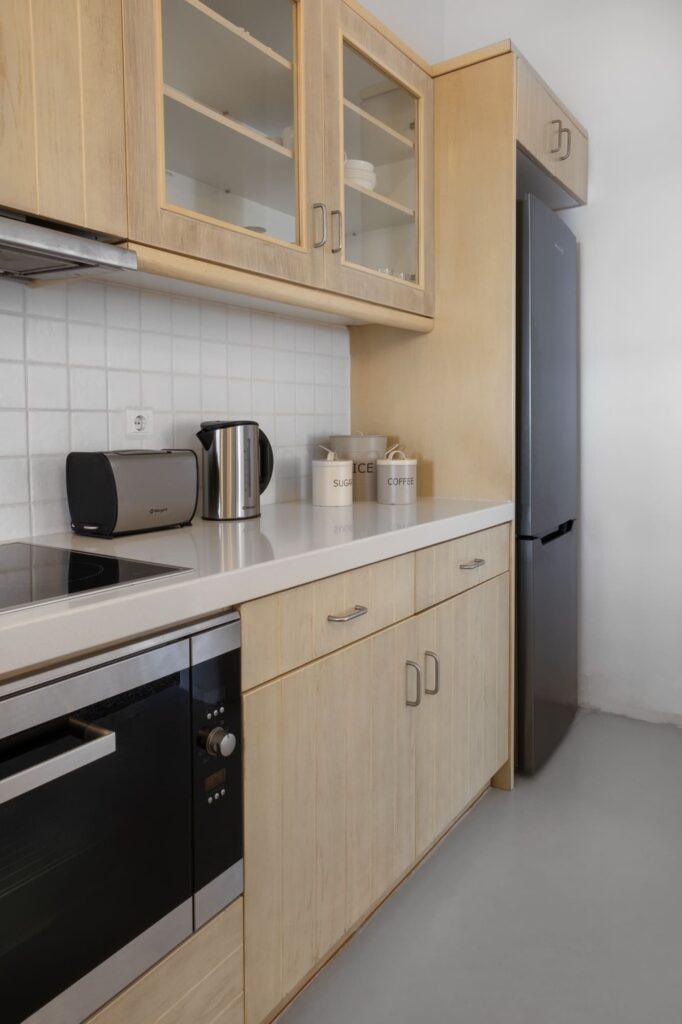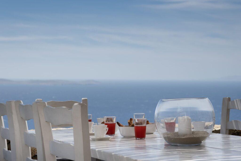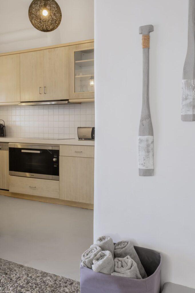 The kitchen at Villa Aither is designed for gourmet experiences. For example, it features high-end appliances and an open-plan layout that flows into the dining area. Moreover, guests can enjoy home-cooked meals or request private chef services for special occasions. As a result, the kitchen supports both casual breakfasts and elegant dinners with uninterrupted sea views.