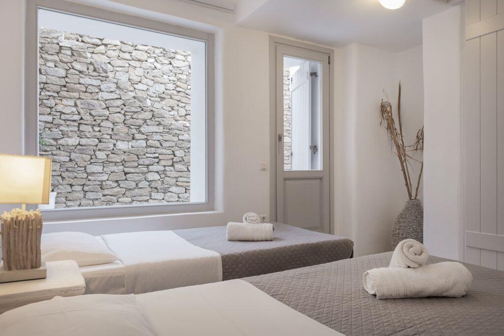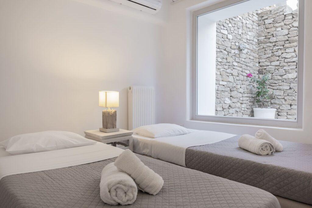 Villa Aither accommodates up to six guests in three beautifully designed bedrooms. The master suite offers a double bed, en-suite bathroom, and dressing room. In addition, two guest bedrooms provide comfort and privacy for friends or family. Because of this, the villa is ideal for peaceful family vacations, escapes with friends, or romantic getaways.