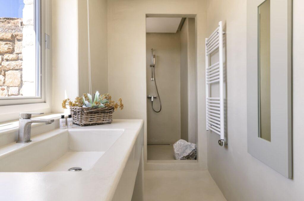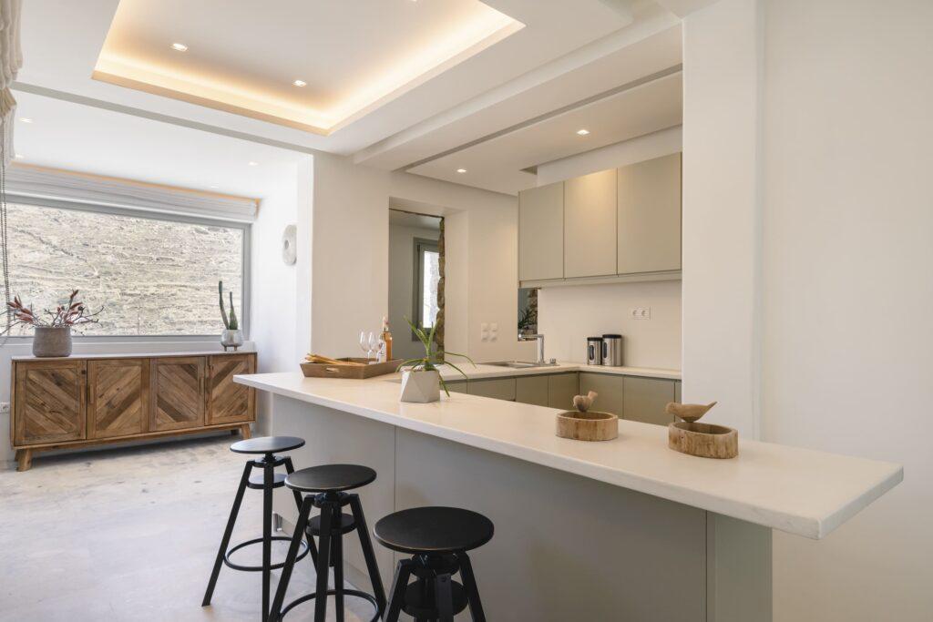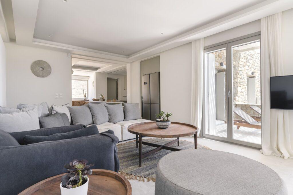 Villa Aqua Ridge is designed for leisure and enjoyment. You can host sunset dinners on the terrace, swim in the infinity pool, or unwind with friends in the open-plan living area. Whenever you seek adventure or tranquility, every detail is curated for luxury. Thus, your Mykonos villa experience remains truly unforgettable.