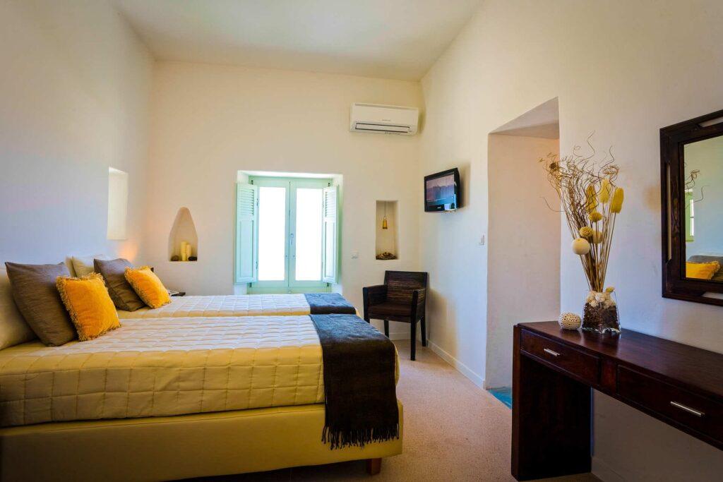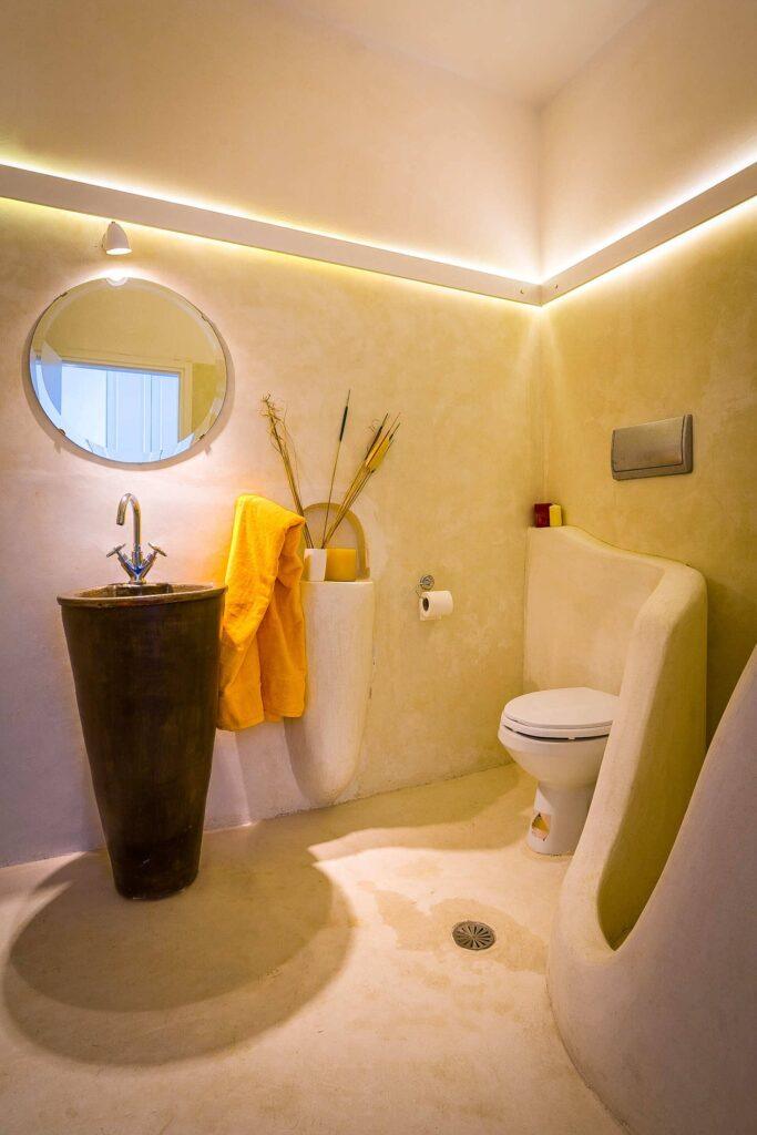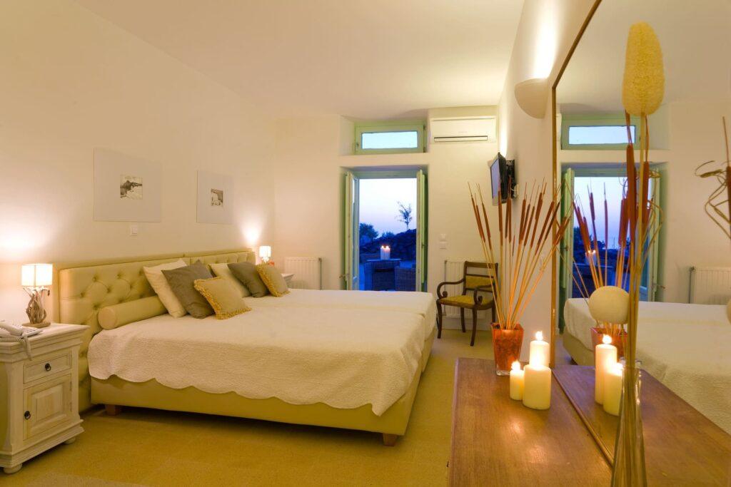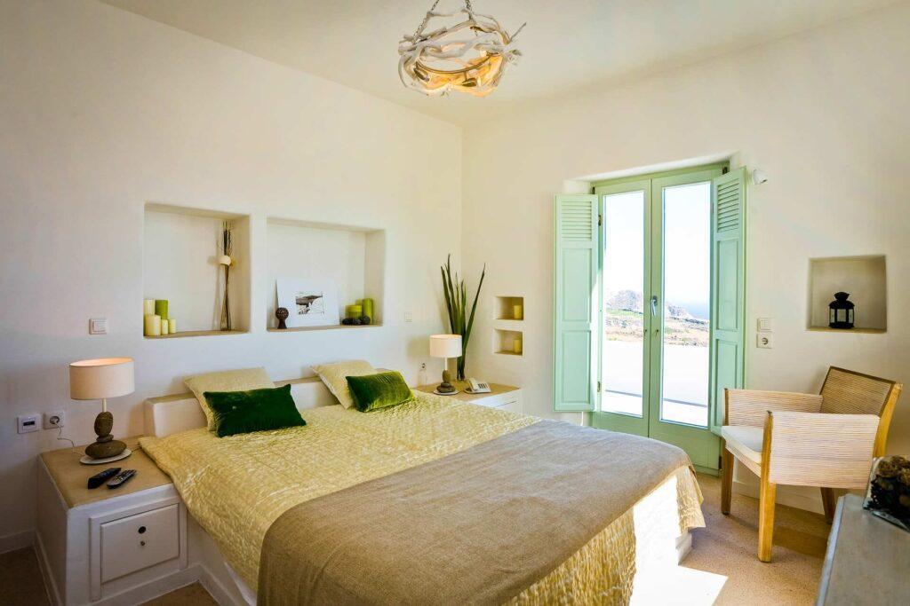 Villa Eclipse accommodates up to ten guests in five luxurious bedrooms, each with an en-suite bathroom, Smart TV, and tranquil Cycladic décor. Because two master suites have direct terrace access and three upper-level bedrooms offer panoramic views, restful nights and privacy are guaranteed. In addition, multiple indoor lounges and reception areas mean families and groups always find comfort and elegance here.