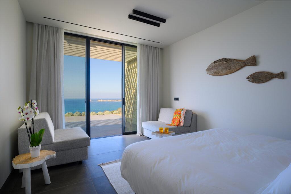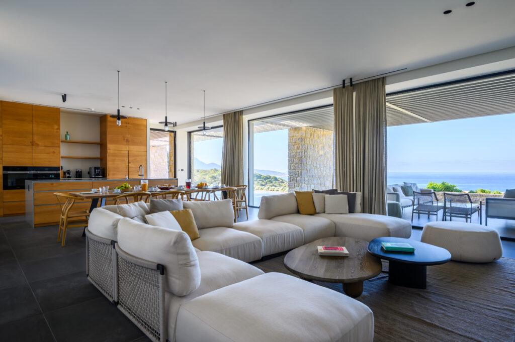 Villa Essence features six luxurious bedrooms, each with convertible king-sized beds and tranquil décor. Five bedrooms have ensuite bathrooms with showers, while one includes a bath for ultimate relaxation. The open-plan living and dining spaces are filled with natural light and frame breathtaking sea vistas. Minimalist design, premium bedding, and high-end amenities ensure every moment is restful. The gourmet kitchen, equipped with Nespresso, warming drawer, and ice maker, invites culinary creativity and effortless entertaining.