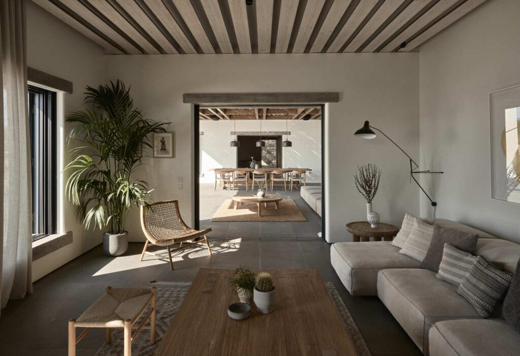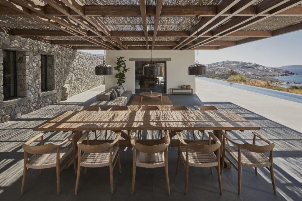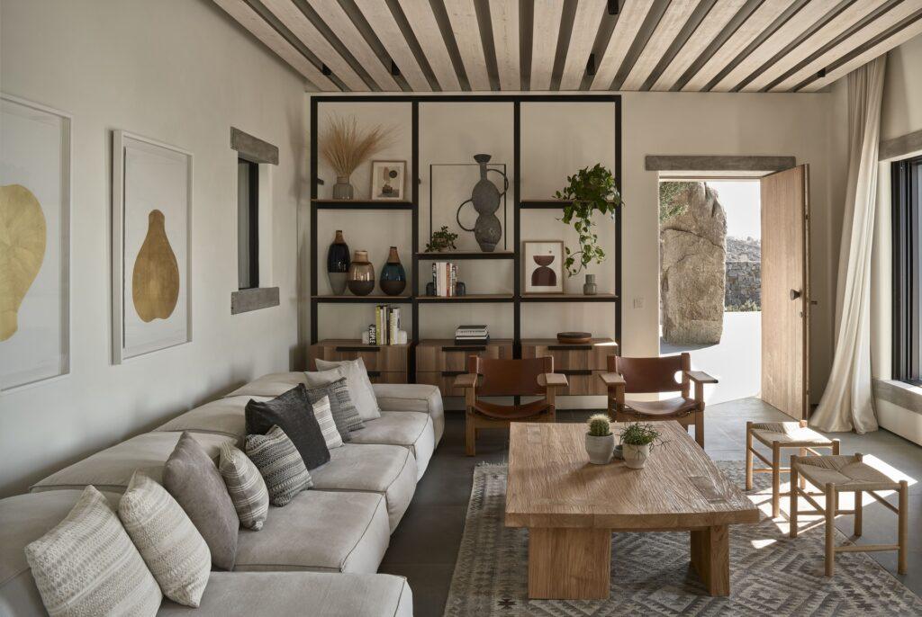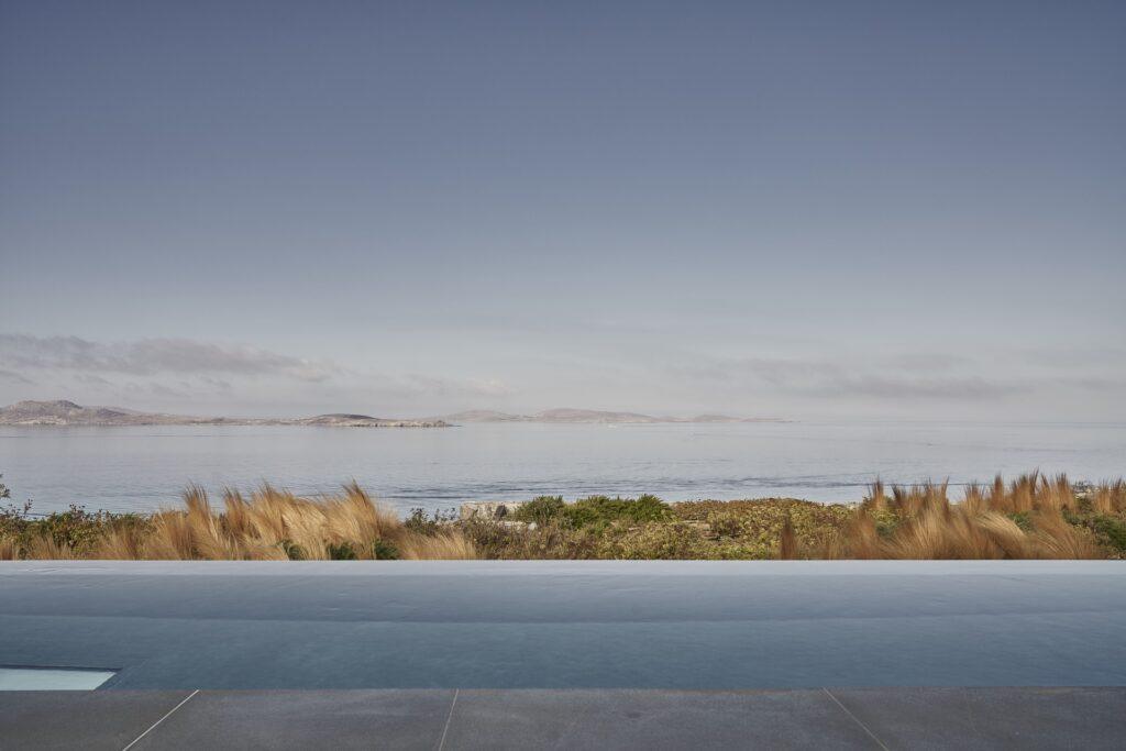 The estate occupies a privileged position on a high ridge overlooking the sea. While the location remains hidden, it is only a 300-meter walk from a quiet, crystal-clear beach. At the same time, the cosmopolitan heart of the island is just 4.5 kilometers away. The site offers a unique perspective on the historical island of Delos. Therefore, guests stay at the crossroads of ancient heritage and contemporary summer living.