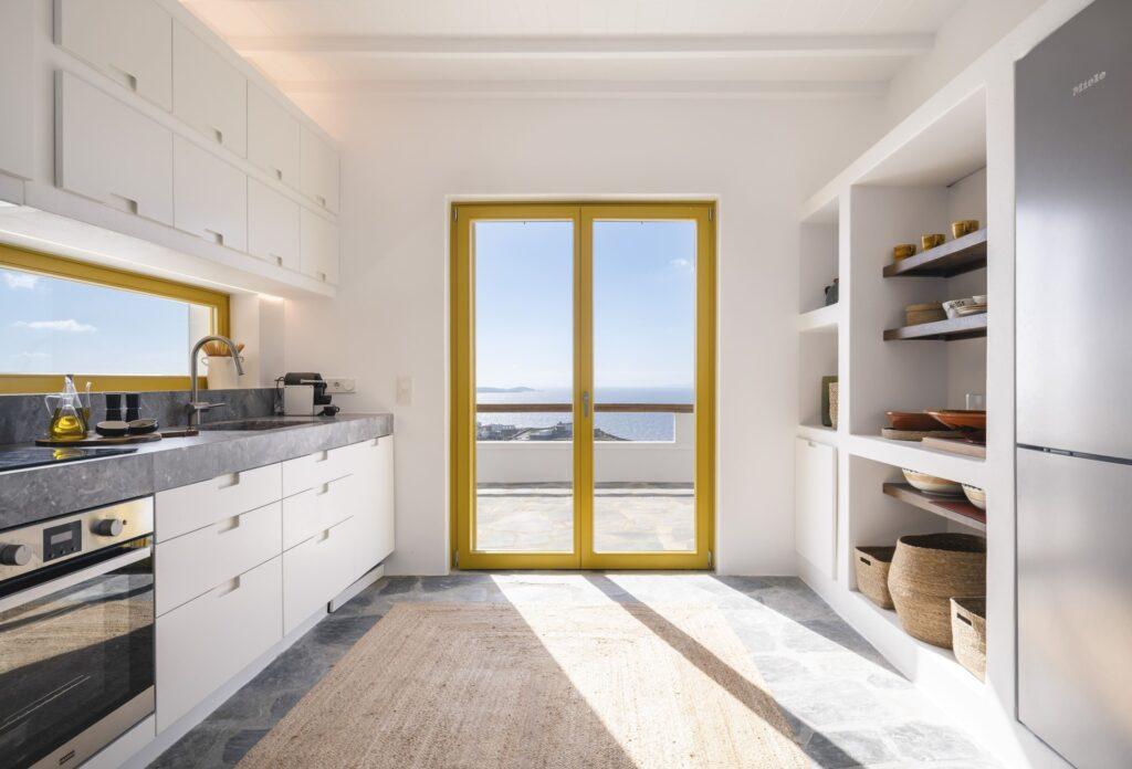 The kitchen features sleek cabinetry and premium stone countertops. Large windows flood the space with natural light. Sea views are visible from the kitchen. In addition, a high-end coffee machine and elegant glassware are included. The kitchen suits both simple breakfasts and private chef services.