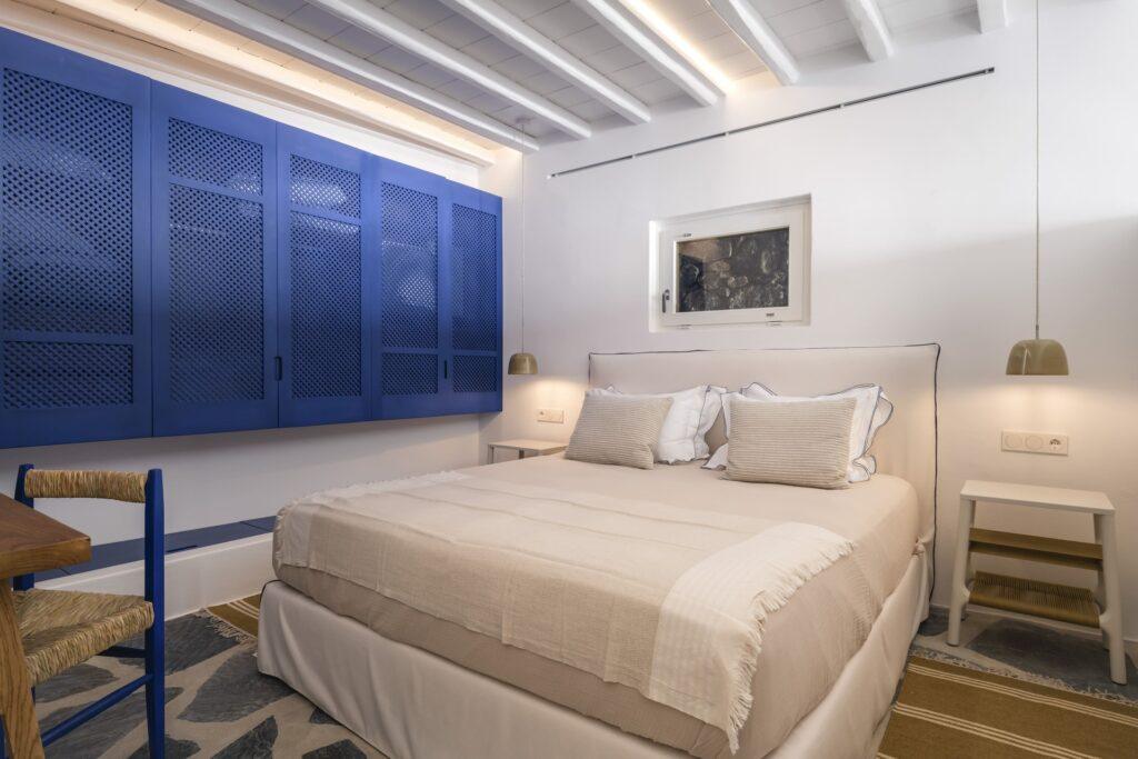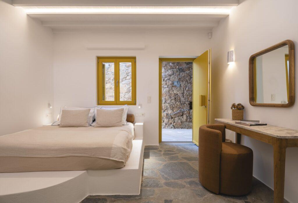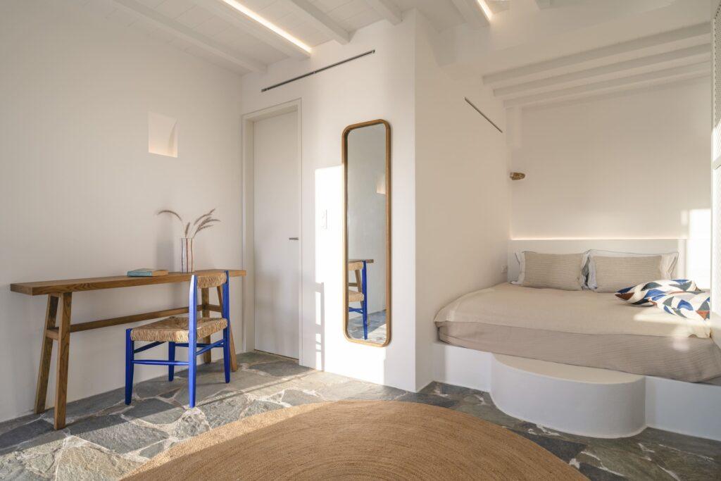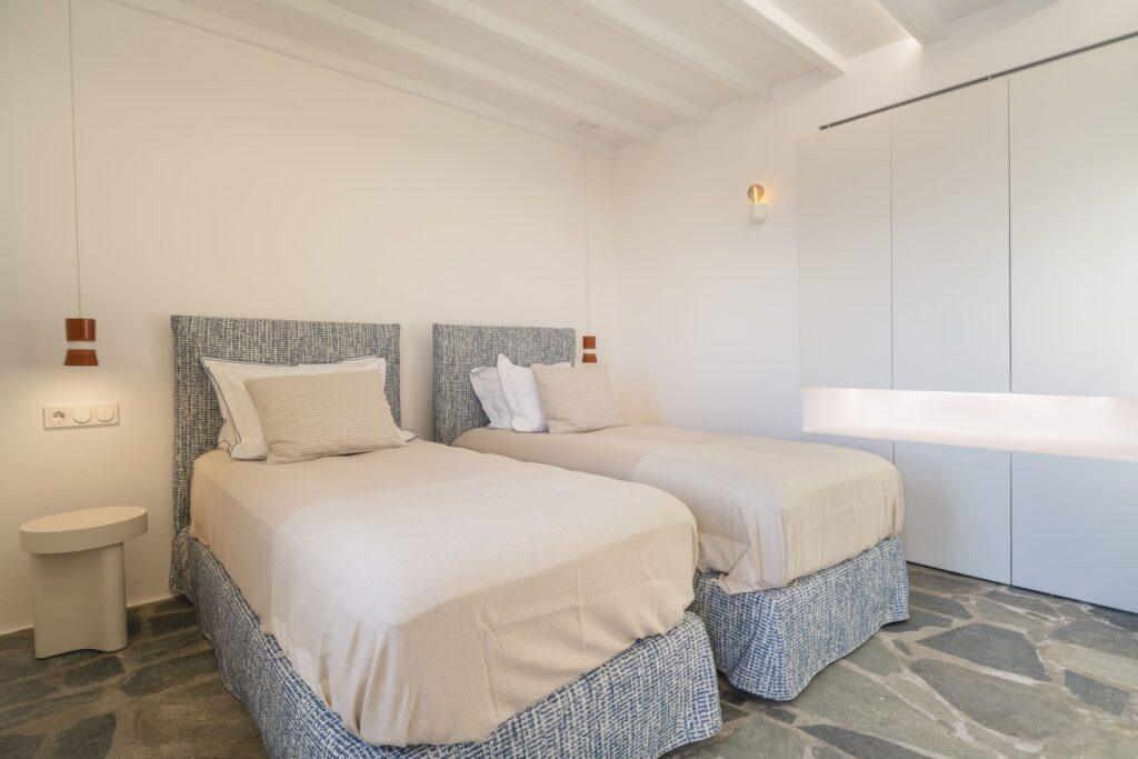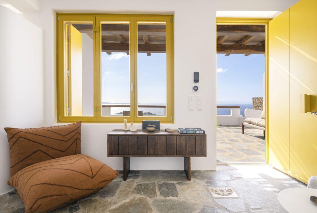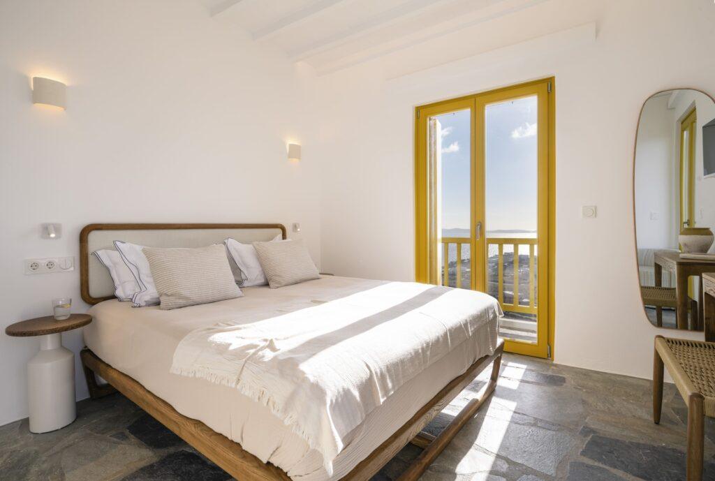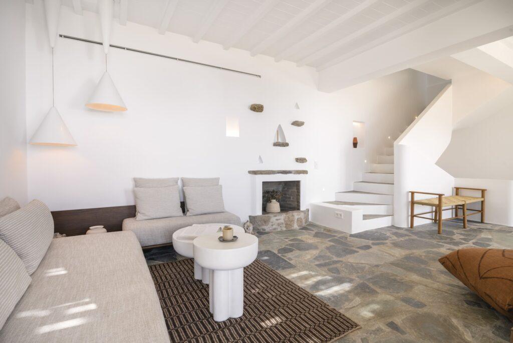 Natural stone floors and neutral tones define the interiors. Each bedroom has a queen-size bed and a plush seating area. Balcony doors invite the fresh Aegean breeze inside. In addition, the living room offers comfortable sofas and sea views. The Fanari heights provide a naturally quiet environment.