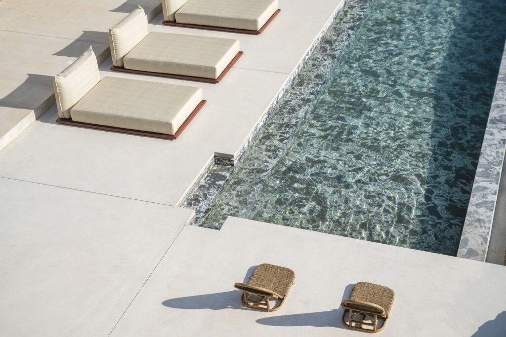 The private pool terrace spans the full width of the villa. It seems to overflow directly into the Aegean blue. Luxury sunbeds surround the pool for daytime relaxation. Furthermore, as the sun sets, the pool area becomes the best sunset viewing point on the island. Premium towels and bath amenities are provided for every guest.
