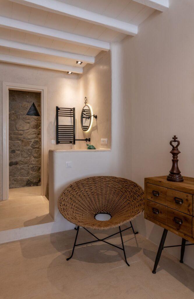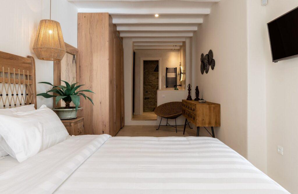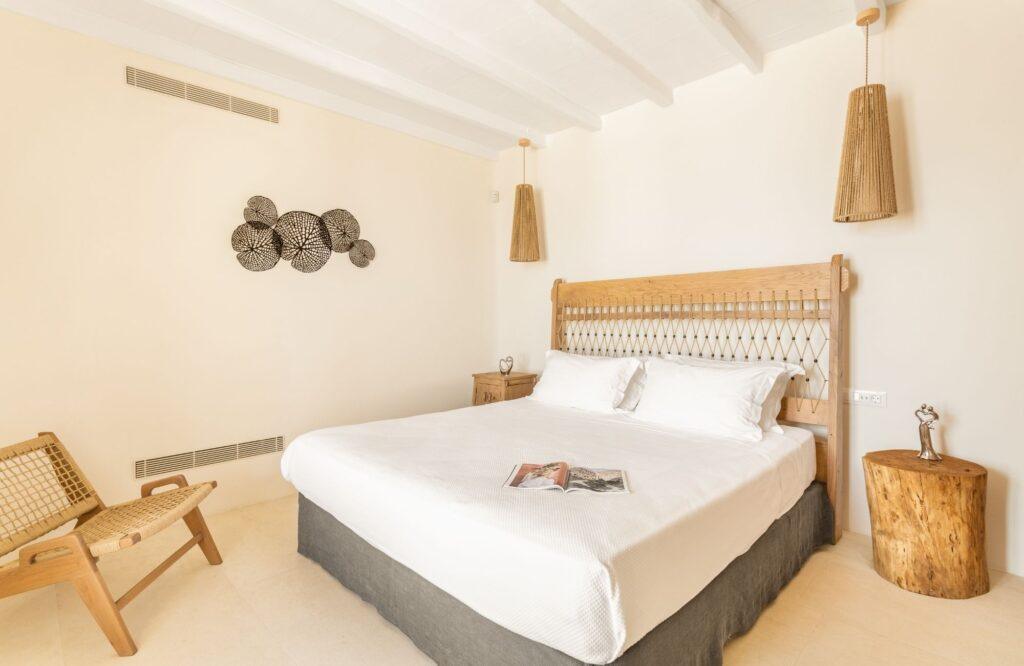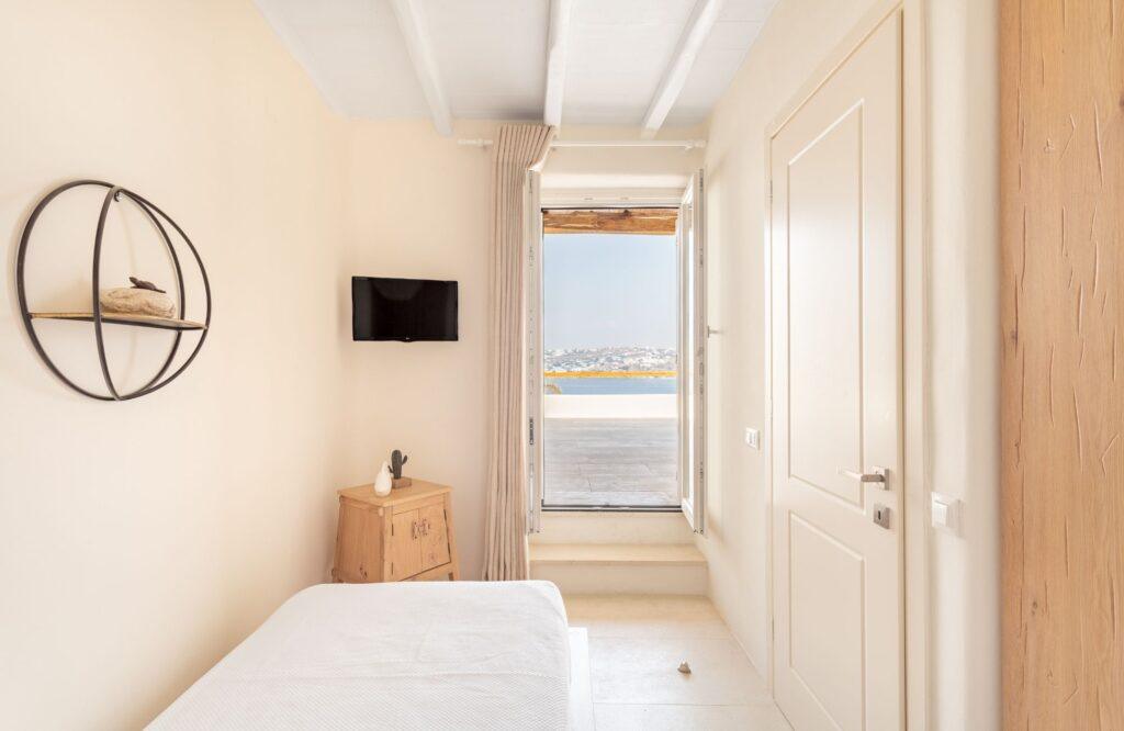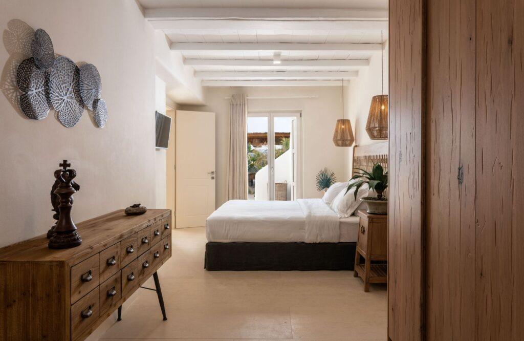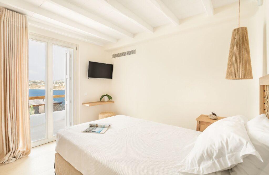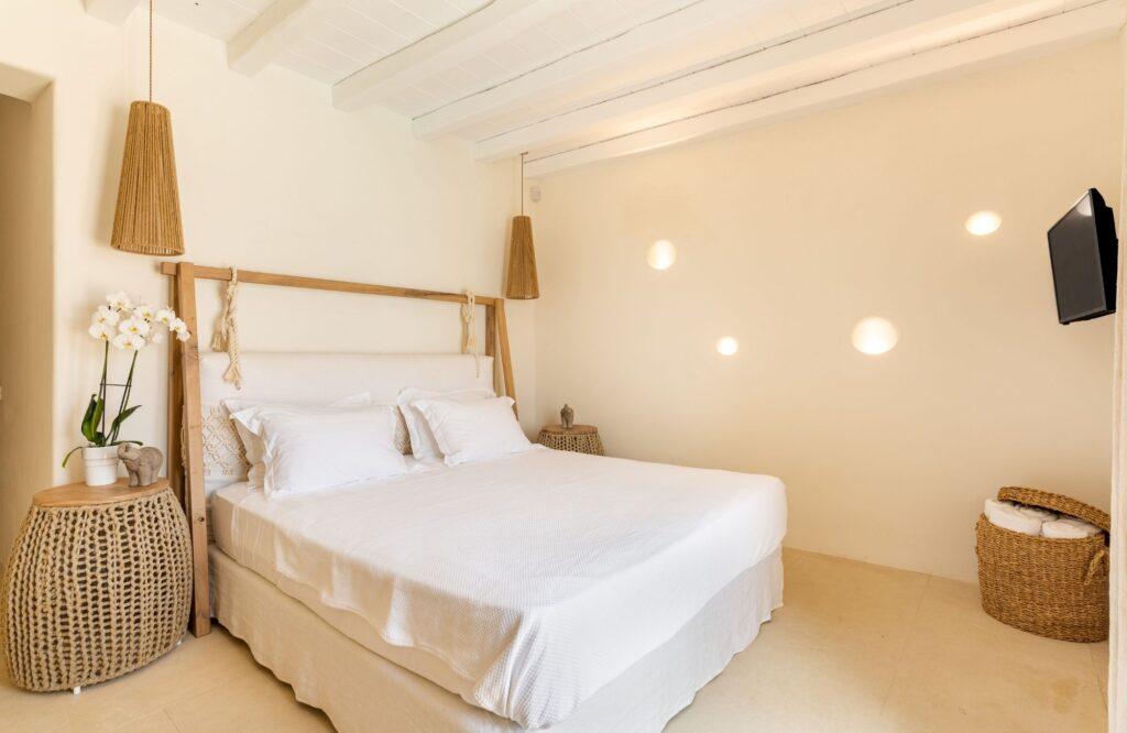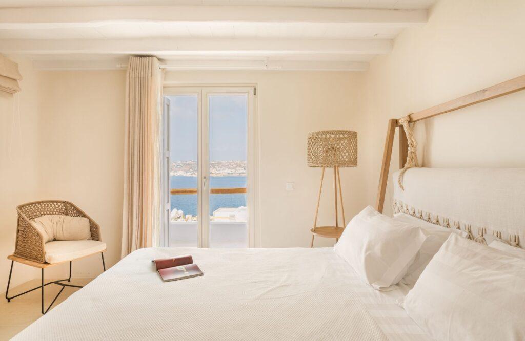 Our accommodation wing features six elegantly designed bedrooms that prioritize restorative sleep and privacy. Each room serves as a private sanctuary, offering modern comforts and ample space for relaxation. Specifically, the master suites feature expansive glass portals that frame the Aegean Sea. We have utilized a sophisticated color palette and high-quality textiles to enhance the sense of tranquility. Thus, the estate provides an unmatched level of comfort for discerning groups and families.