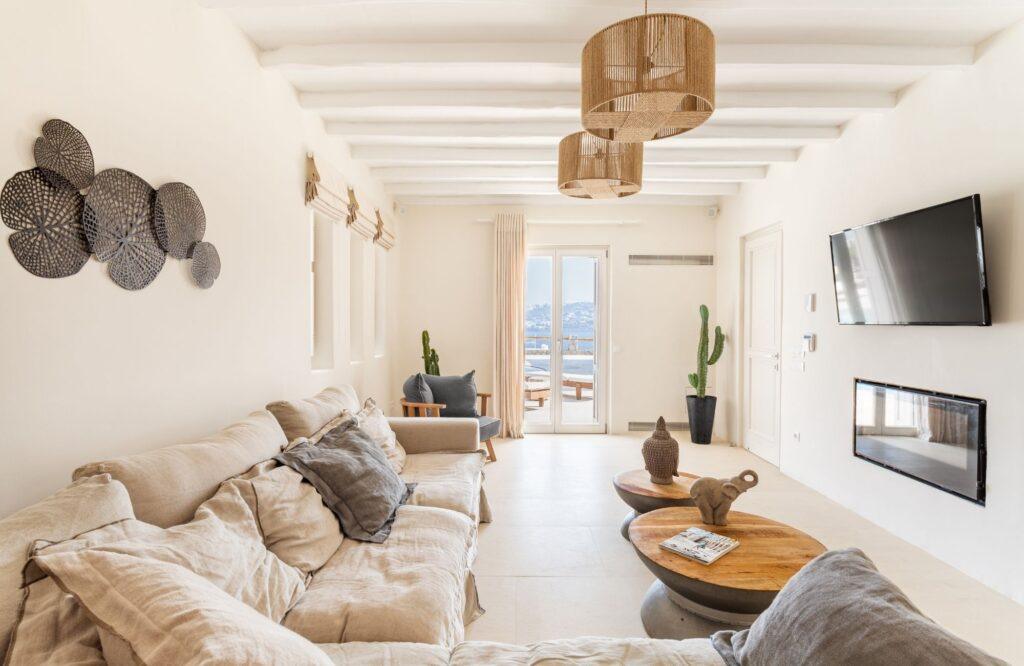 Villa Node occupies a strategic position just minutes from the airport and the island’s most iconic marinas. While the exact coordinates remain private, the estate sits just 600 meters from the nearest white-sand beach and the elite beach clubs of Ornos Bay. You can reach the legendary nightlife and world-class shopping of Mykonos Town within a five-minute drive. Thus, the villa acts as a central “node,” connecting you to everything the island has to offer.