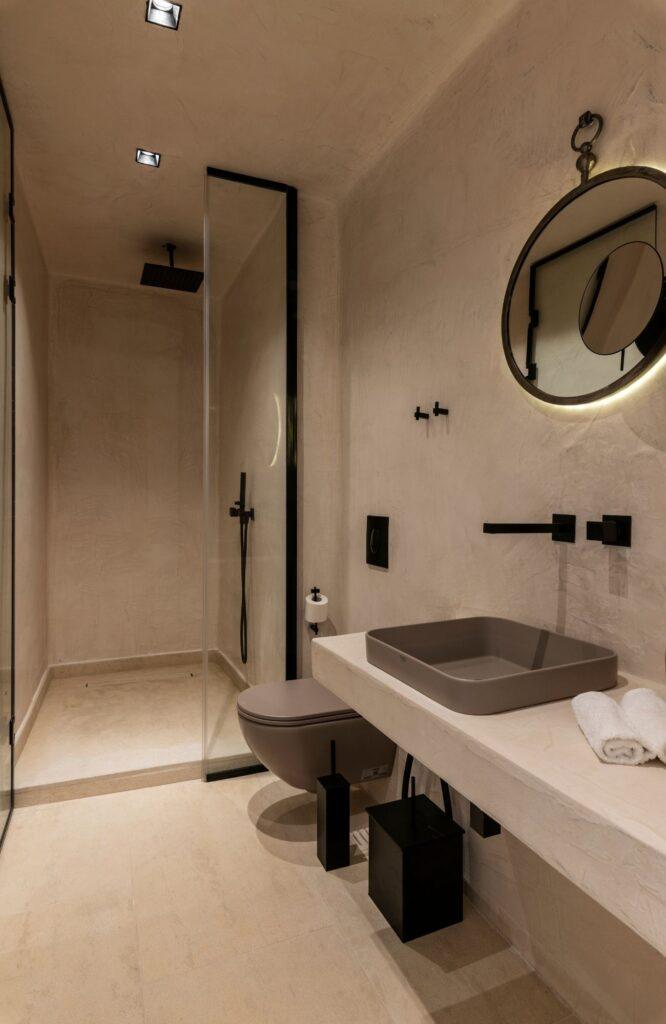 The architecture of Villa Node focuses on creating a seamless flow between indoor luxury and the coastal landscape. The living room features deep-seated sofas and curated décor that invite you to unwind after a day at the beach. Moreover, the clifftop terrace offers shaded lounging areas and plush sunbeds for ultimate relaxation. Large pergolas provide a cool retreat from the Mediterranean sun throughout the day. As a result, guests enjoy a profound sense of well-being within a space that breathes with the sea.