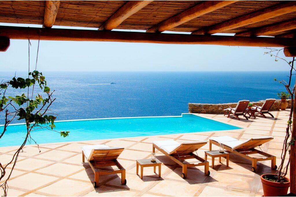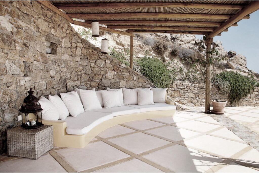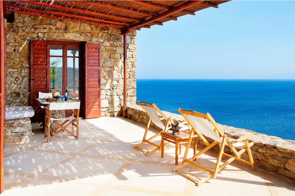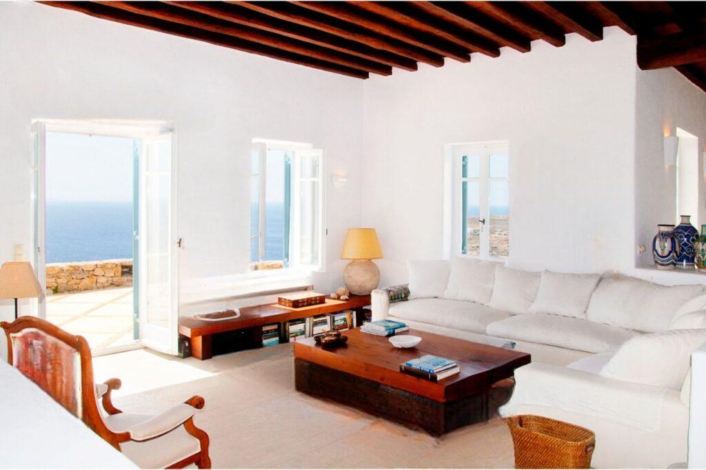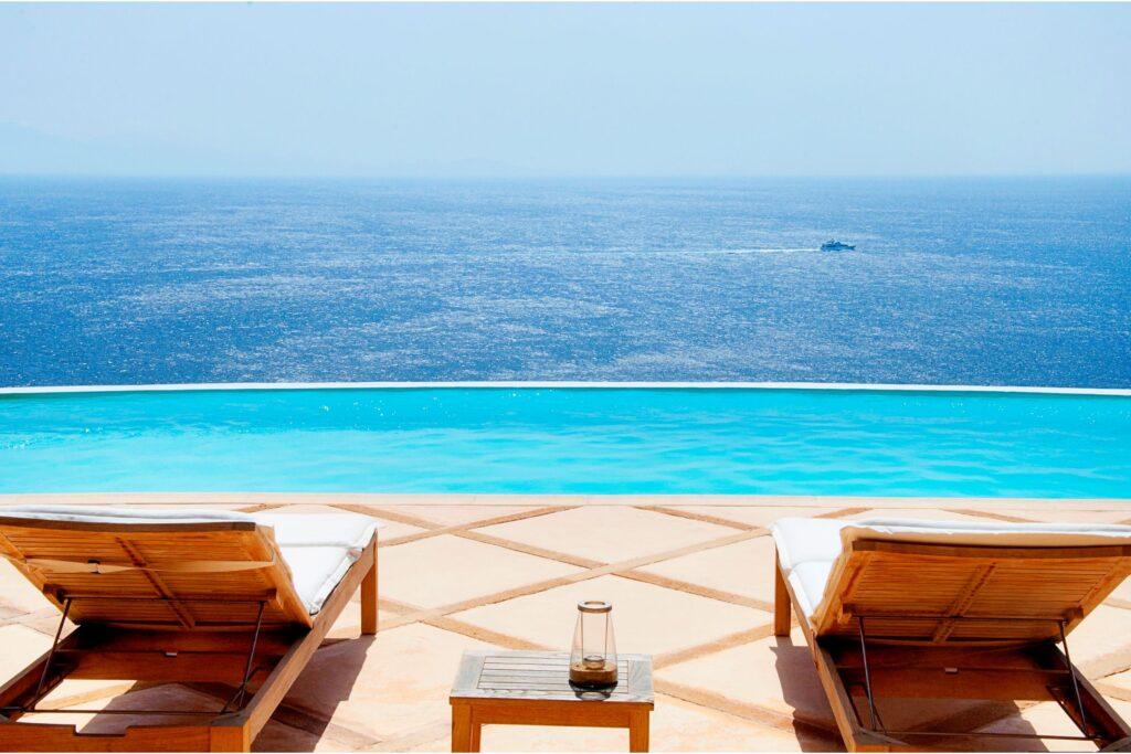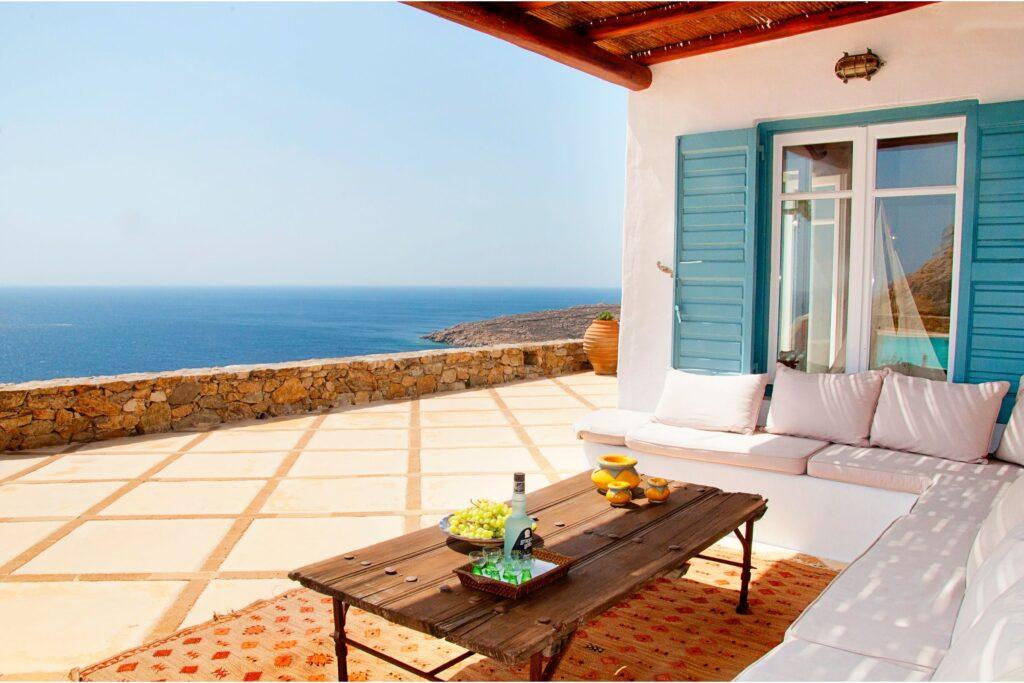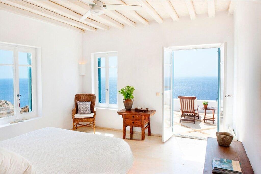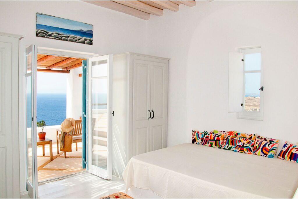 Villa Rock accommodates up to ten guests across five luxurious bedrooms. Each suite has an en-suite bathroom and expansive sea views. In addition, the independent guest house provides added privacy for VIP guests. Because of this, families, friends, or groups seeking exclusive comfort in Mykonos will find the ideal setting.
