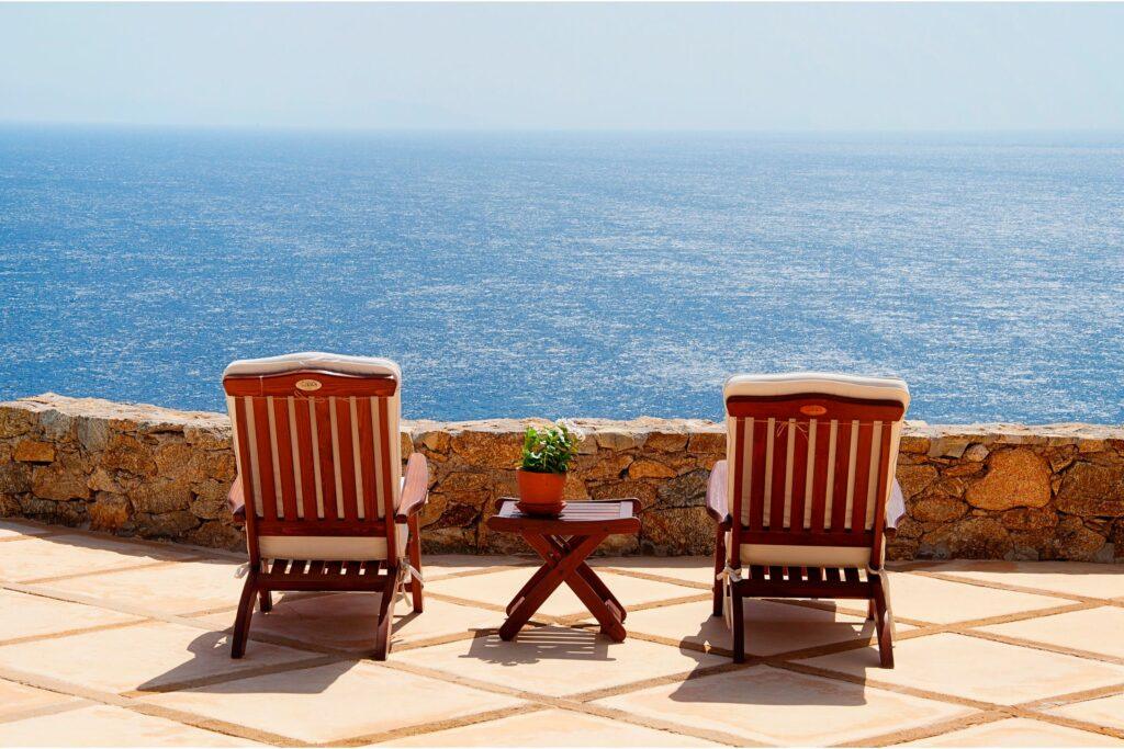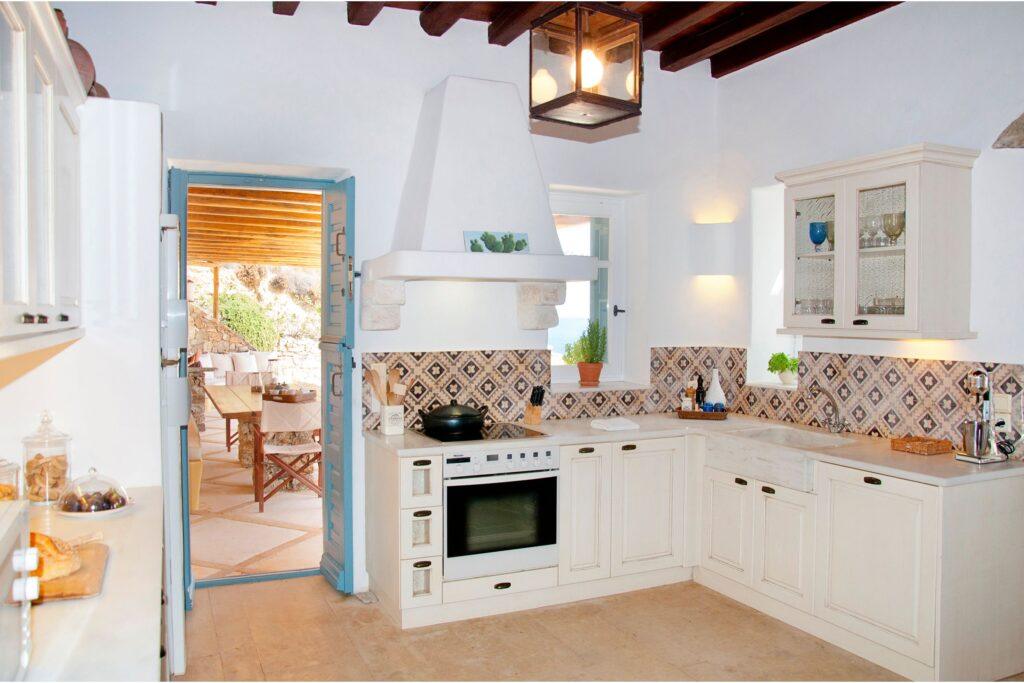 The villa’s chef’s kitchen is designed for gourmet experiences. For example, it features high-end appliances and a spacious open-plan layout that flows into the living and dining areas. Moreover, guests may request a private chef for unforgettable meals. As a result, the kitchen supports both intimate breakfasts and lavish celebrations with panoramic views of the Aegean Sea.