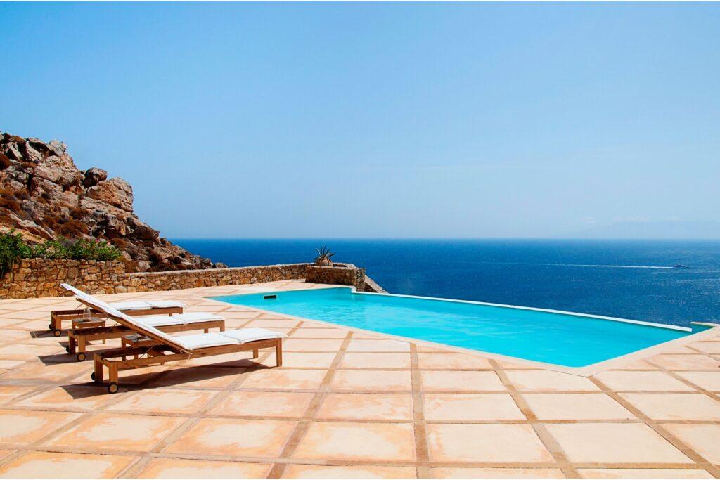 Villa Rock is a waterfront luxury villa in Mykonos with a private infinity pool and direct sea access. Additionally, this masterpiece of Cycladic architecture sits perched on a dramatic cliffside, offering privacy, breathtaking Aegean views, and a private pathway to a secluded rocky beach. As a result, guests enjoy a hypnotic retreat designed for high-net-worth travelers who demand elegance, exclusivity, and seamless access to Mykonos’ most iconic beach clubs.